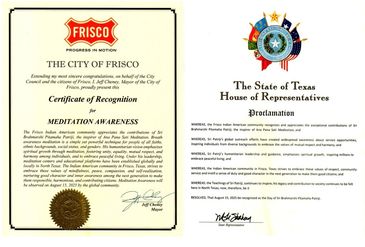 The State of Texas declares August 15th as Brahmarshi Pitamaha Patriji day. The City of Frisco declares August 15th 2025 as Meditation Awareness for the contribution of Sri Brahmarshi Pitamaha Patriji, the inspirer of Anapanasati meditation.